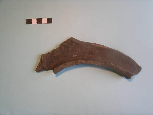 Frammento di orlo di vaso biconico con labbro ingrossato verso l'interno, che forma un'ampia tesa orizzontale, su cui era applicata una presa/ansa di cui restano solo gli attacchi.
