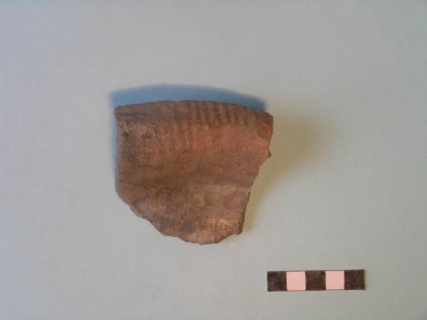 Frammento di scodella carenata, labbro ingrossato a tesa orizzontale, parete verticale concava; la tesa è decorata da fitte solcature radiali, sotto alle quali è, all'interno dell'orlo, una fila di punti impressi; la vasca è decorata all'interno da una fila concentrica di punti impressi, all'esterno da un fascio di solcature radiali.