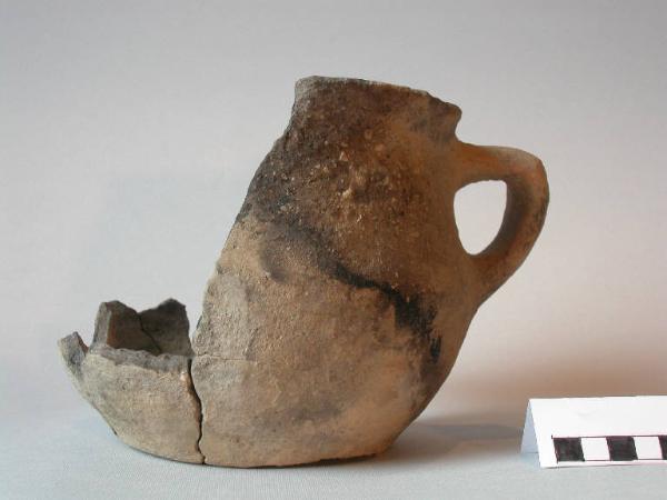 Vaso biconico ansato (anfora?), orlo piatto, labbro esoverso, parete rastremata rettilinea, carena arrotondata a circa metà altezza, fondo piatto; al di sotto dell'orlo è impostata un'ansa a gomito con braccio superiore orizzontale, che termina sulla carena.