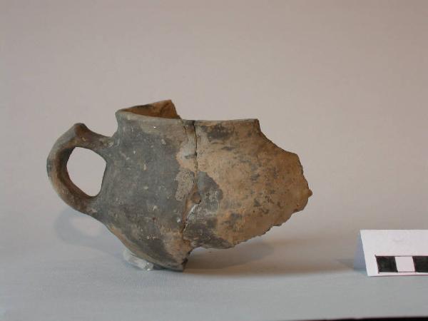 Tazza carenata frammentaria, orlo piatto, breve labbro distinto verticale, parete rastremata rettilinea, carena arrotondata, vasca a calotta; al di sotto dell'orlo è impostata un'ansa a gomito con breve appendice asciforme e braccio superiore obliquo, che termina al di sotto della carena.