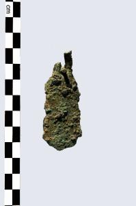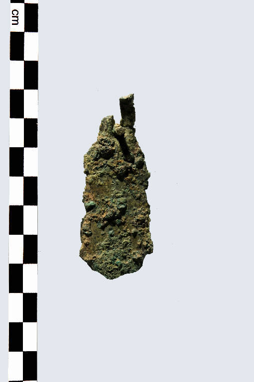 Lama di pugnale con codolo a due costolature e foro con ribattino conservato posto alla base.