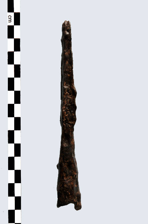 Cuspide di giavellotto con innesto a cannone; la lama, foliata e ampiamente corrosa su entrambi i lati, presenta una costolatura mediana triangolare, rilevata su entrambe le facce, che si estende sino all'inizio del cannone.