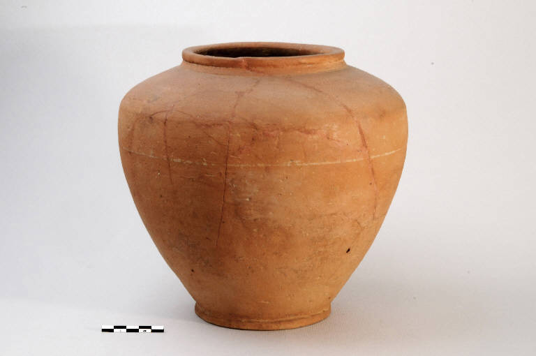 L'olla in ceramica comune presenta l'orlo estroflesso sagomato a mandorla ed appiattito superiormente ed un brevissimo collo troncoconico; la spalla, rialzata ed espansa, è a spigolo vivo; il corpo espanso si svasa verso il fondo. Il piede è a disco. Si conserva traccia della decorazione: in prossimità della spalla è visibile una banda sovraddipinta di colore giallo-avorio.