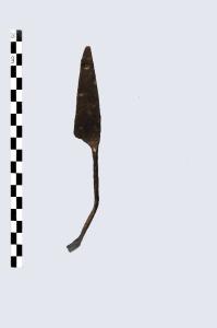 Cesoie in ferro di cui si conserva una lama di forma triangolare allungata a taglio diritto e dorso lievemente convesso e parte dell'anello di presa contorto ed in parte ripiegato. Il manufatto è ascrivibile al tipo medio La Tène vista la presenza dell'incavo semicircolare all'inizio delle lame .