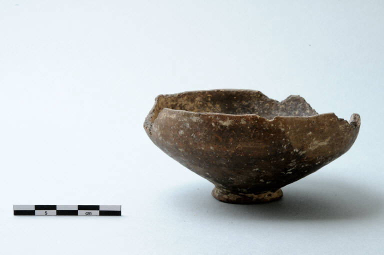 Ciotola in ceramica comune con orlo lievemente introflesso ; attacco orlo-parete carenato; vasca troncoconica con pareti bombate; piede ad anello sagomato. Variante 1C.