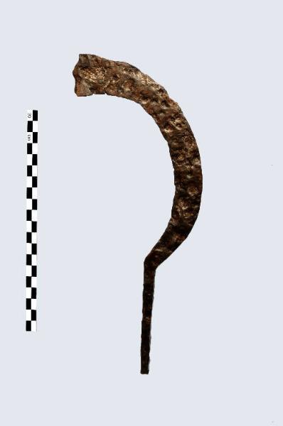 Fibula in ferro di schema MLT, con arco arcuato, staffa ripiegata ed agganciata alla sommità dell'arco, della quale resta il globetto di congiunzione; molla bilaterale a sei avvolgimenti, con corda esterna. La fibula è priva di parte dell'ardiglione.