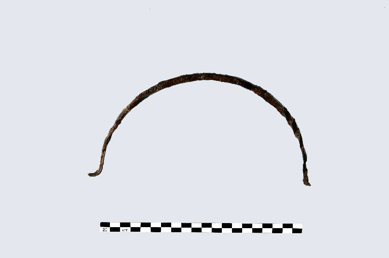 Asta in ferro sagomata a forma di arco ricurvo; entrambe le estremità presentano il margine rialzato. Si tratta, assai probabilmente, di un manico pertinente ad un recipiente metallico.