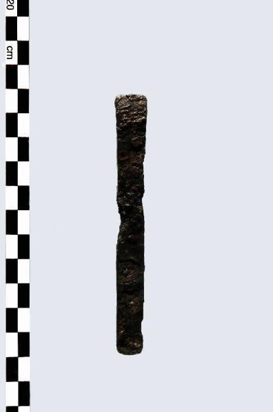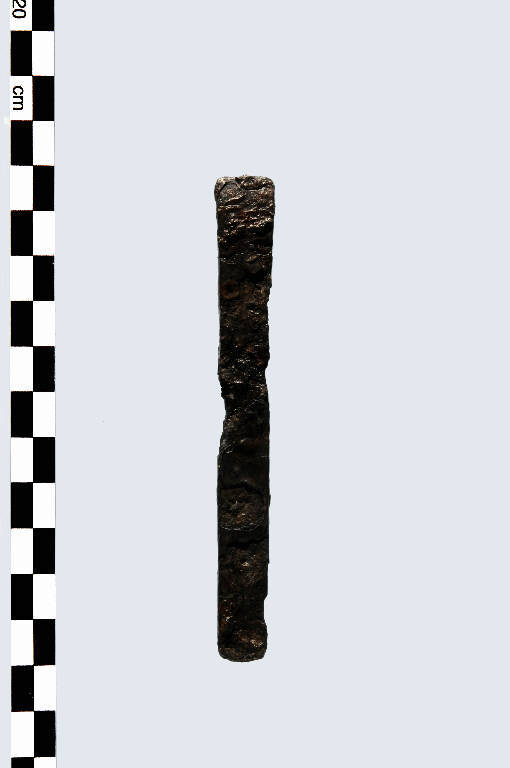 Frammento di verga di metallo a sezione quadrangolare allungata che si assottiglia alle estremità; viste le caratteristiche del manufatto, risulta essere difficile stabilire l'oggetto di pertinenza ed il suo utilizzo.