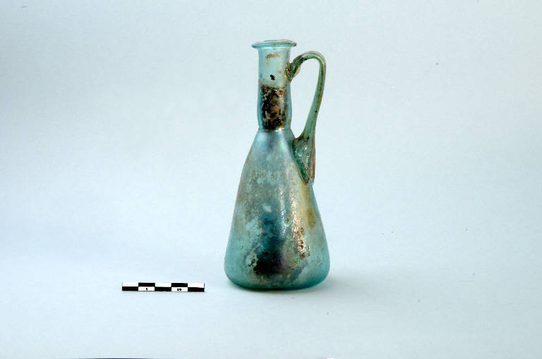 Brocca o lagoena in vetro soffiato verde-azzurro, tipo Isings 55a, variante più antica. Si tratta di un contenitore per liquidi assai diffuso in epoca romana tra la metà del I e la fine del II secolo d.C.