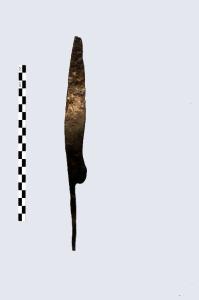 Coltello in ferro, con dorso convesso e lama serpeggiante; breve codolo per l'immanicatura a sezione rettangolare.