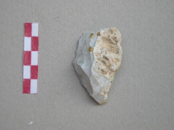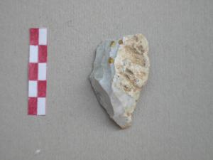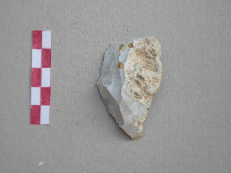 scheggia di preparazione di nucleo, in selce di colore beige, ricoperta per i 2/3 della superficie da patina bianca e per la parte restante dal cortice. sono visibili stacchi di lame.