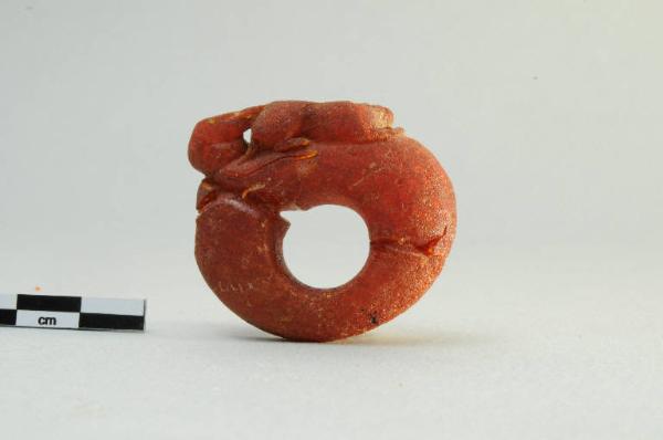 Grosso anello digitale in ambra a sezione circolare, nel punto di massimo spessore è intagliata una figura animale di difficile interpretazione (scoiattolo?)