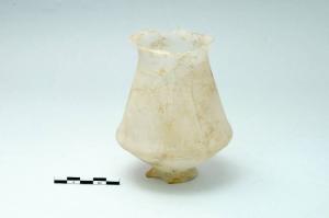 Bicchiere carenato in vetro soffiato incolore, orlo estroflesso decorato da due linee incise, parete rastremata , piede ad anello