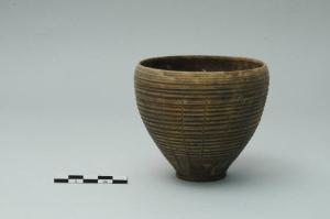 Vasetto a pareti sottili, corpo espanso verso l'alto e molto rastremato in basso, orlo leggermente rientrante e piede a disco, il corpo è decorato da fitte linee orizzontali incise e da altre verticali.