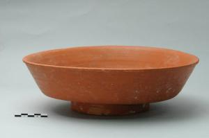 Piatto in terra sigillata, orlo leggermente ingrossato verso l'esterno, cprpo carenato e piede ad anello.