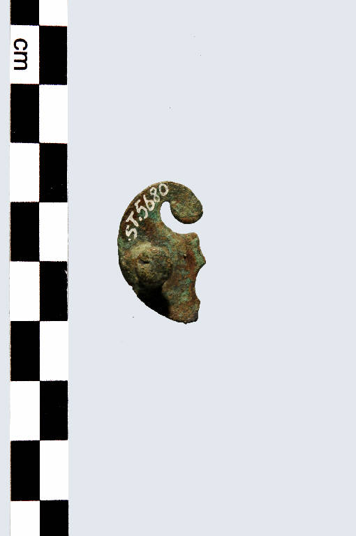 Guarnizione peltiforme bronzea per cinturoni militari. Sulla parete interna è inserito un chiodino con capocchia arrotondata, appiattito superiormente.