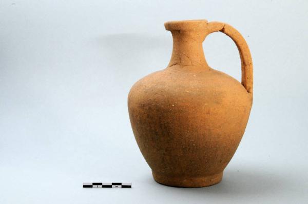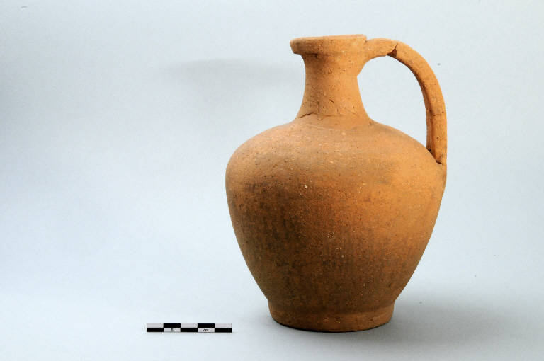 Olpe con orlo estroflesso a profilo squadrato con incavo interno, collo rastremato, ansa a nastro costolata impostata appena sotto l'orlo e appoggia sulla spalla, corpo globoso e piede a disco.