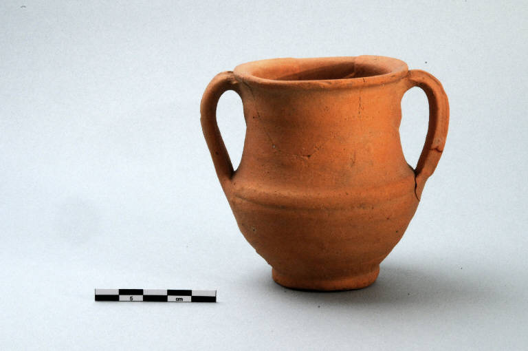 Boccale biansato carenato; orlo estroflesso, anse costolate impostate sotto l'orlo e appoggiate alla carena arrotondata, corpo biconico e piede a disco.