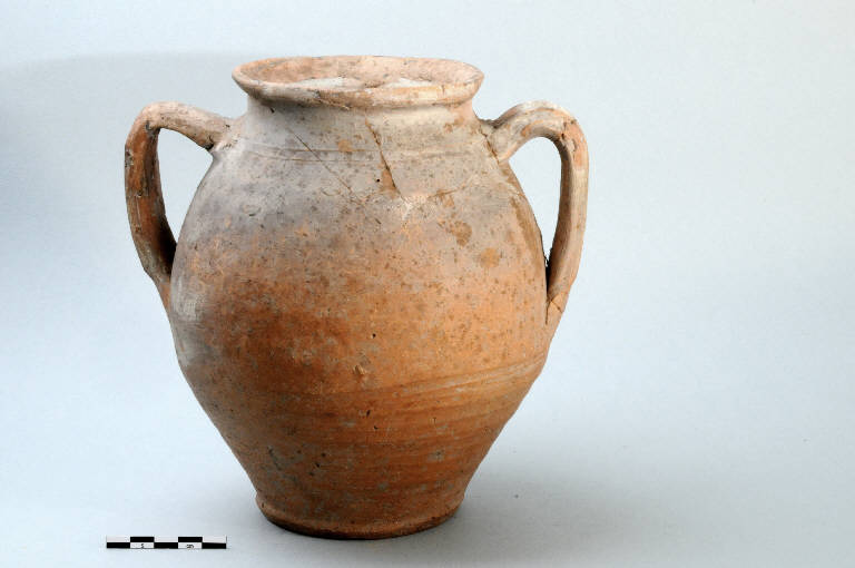 Anforetta biansata; le due anse sono asimmetricche, piede ad anello. Restano tracce di invetriatura grigia sul corpo.