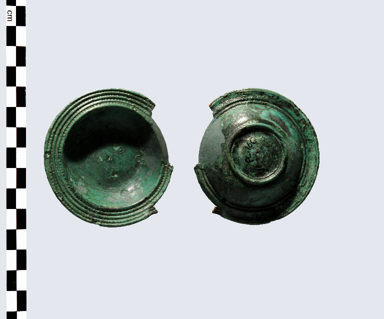 Attingitoio / patera da bagno in bronzo con bacino poco profondo e orlo a tesa decorato da fasce concentriche con all'interno un motivo a trattini paralleli, fondo con piede ad anello.