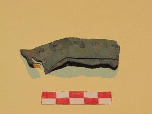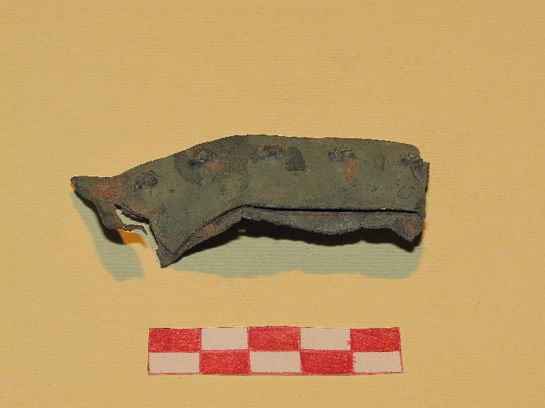 Due frammenti laminari in bronzo tenuti insieme da cinque ribattini passanti.