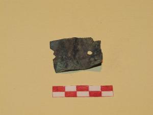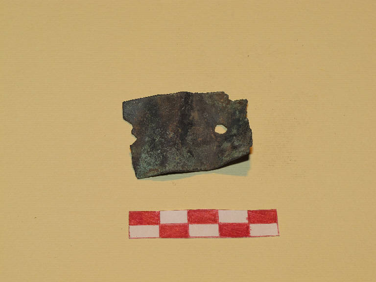 Lamina bronzea con lati lunghi regolari e foro circolare passante.