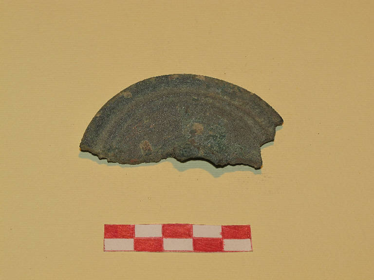Disco in piattina bronzea con solcature ed incisioni circolari concentrici sulla superficie esterna.