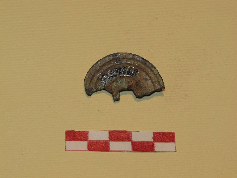 Disco in piattina bronzea con solcature circolari concentrice e foro lacunoso quadrato a centro; sotto il bordo porzione di parete verticale.