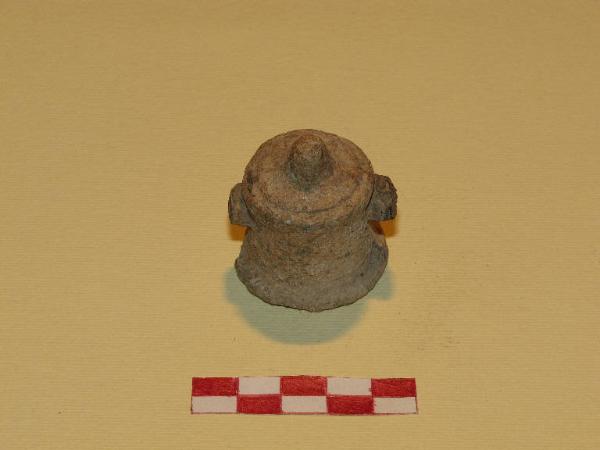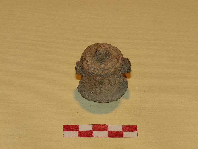 Tintinnabulo bronzeo di forma campanulata con punta sulla sommità e due bugne laterali che tengono una barretta interna.