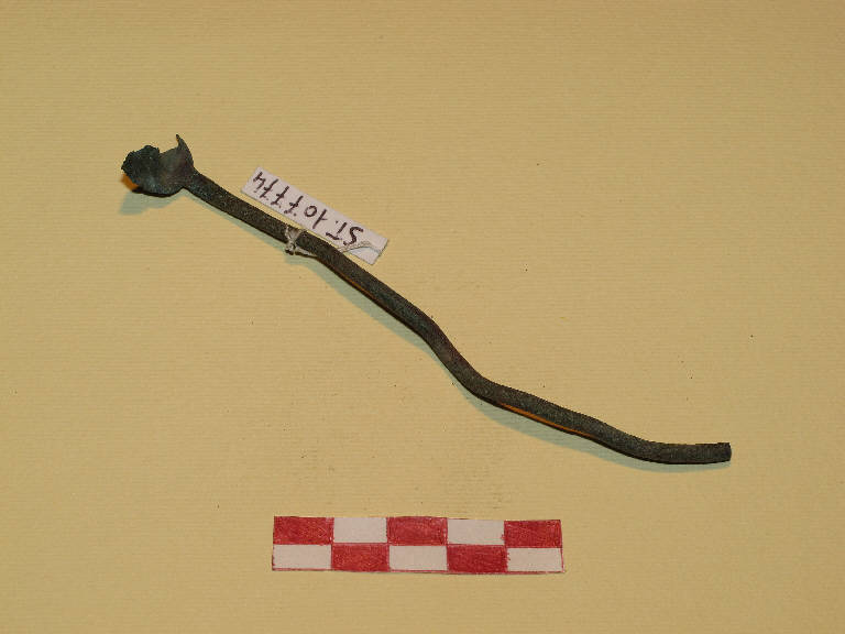 Manico di ligula in tondino di bronzo con frammento di lamina ad un capo
