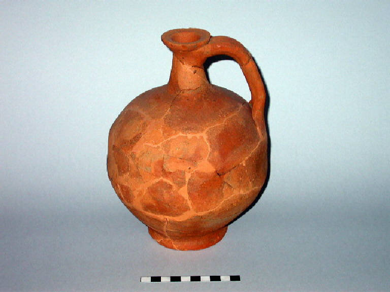 Esemplare di olpe in ceramica comune depurata appartenente al corredo della tomba n. 14 della necropoli delle Quintane, presenta un orlo estroflesso superiormente piatto, alta spalla accentuata, ansa a nastro bicostolata con solcatura verticale impostata sulla spalla e piede a disco.