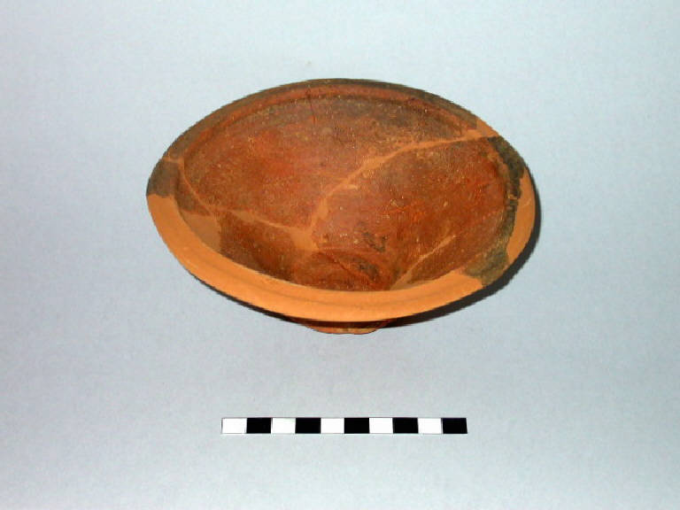 Coperchio in ceramica comune da fuoco, presenta orlo a breve tesa con scanalatura per appoggio, corpo troncoconico e presa a bottone all'interno cava.