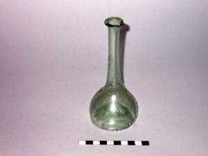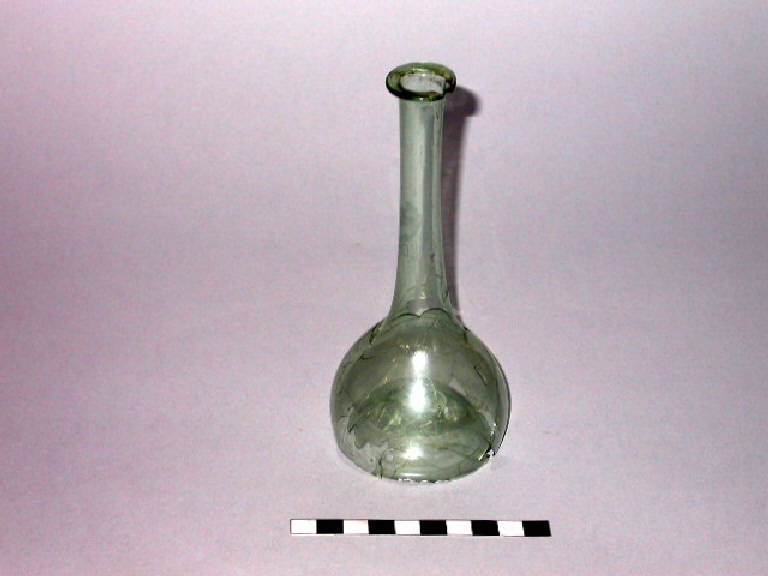 Balsamario con labbro ripiegato a cordoncino, lungo collo sottile, corpo campaniforme, fondo concavo.