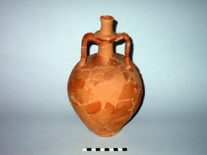 Diota in ceramica comune semidepurata con orlo verticale, collare plastico piuttosto accentuato, collo svasato, anse bicostolate leggermente rialzate, corpo globulare con spalla rialzata, fondo piano