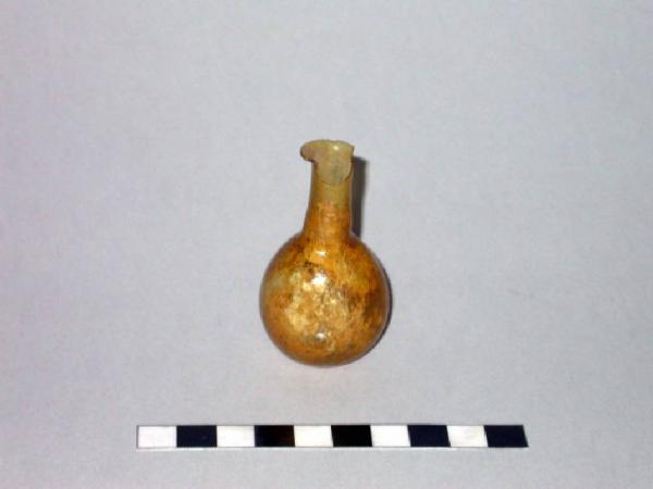 Balsamario in vetro giallo con orlo estroflesso, collo cilindrico e corpo piriforme