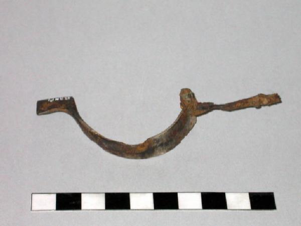 Fibula in ferro con arco appiattito a sezione quadrangolare, ardiglione spezzato a sezione circolare.