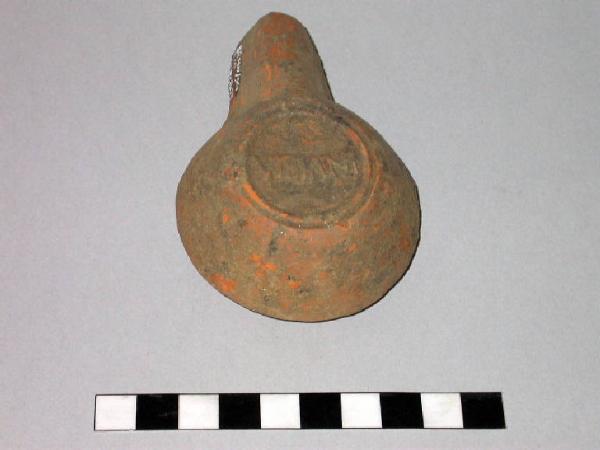 Lucerna co canale aperto con due borchiette sulla spalla e due anelli incisi sul fondo