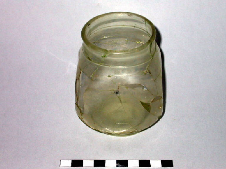 Bicchiere in vetro con orlo verticale leggermente ingrossato, sottile collarino all'attacco con la spalla, corpo globoso con quattro depressioni circolari e piede ad anello.
