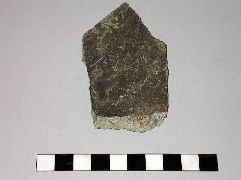 Frammento di parete di recipiente cilindrico in pietra ollare; presenta una superficie interna con fitte solcature orizzontali ed esternamente è annerita.