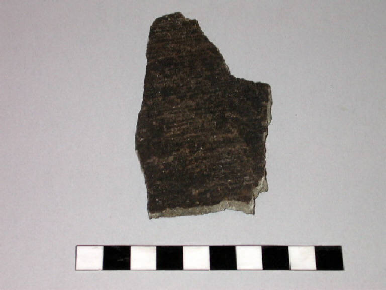 Frammento di parete di recipiente cilindrico in pietra ollare; presenta sulla superficie esterna, completamente annerita ,fitte solcature orizzontali
