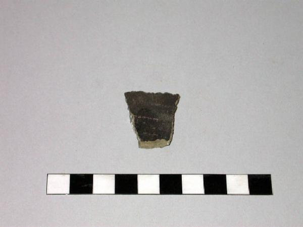 Frammento di parete di recipiente cilindrico in pietra ollare; presenta all'esterno una superficie annerita caratterizzata da larghe scanalature.