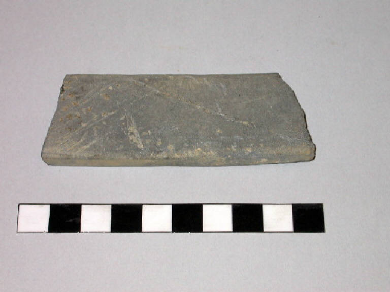 Cote rettangolare in pietra grigia levigata con tracce d'uso.