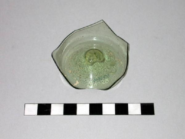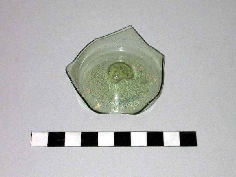 Frammento di fondo concavo di bottiglia in vetro verdino con corpo presumibilmente ovoide