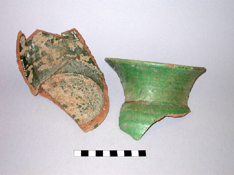 Frammenti di boccale in ceramica ingobbiata sotto vetrina monocroma verde, con corpo panciuto, larga imboccatura circolare, basso collo leggermente svasato, orlo ingrossato ed estroflesso, piede a disco