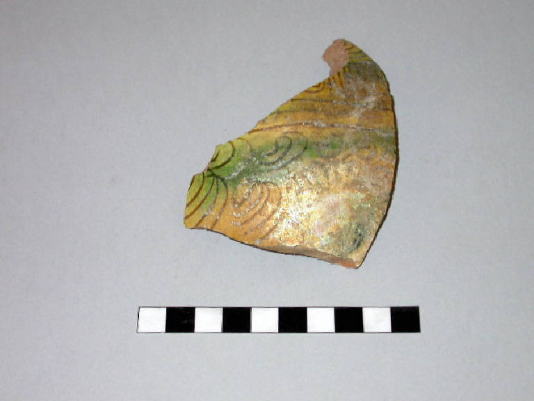 Frammento di boccaele a corpo globoso in ceramica ingobbiata graffita, dipinta ed invetriata.