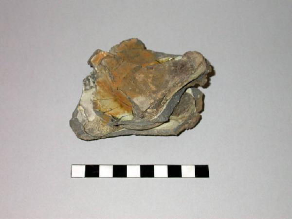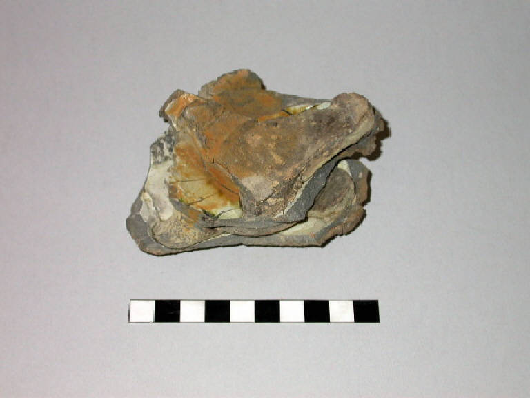 Scarto di seconda cottura in ceramica ingobbiata, graffita e verniciata formato da fondi di ciotole graffite e distanziatori a zampa di gallo, saldati insieme per stracottura
