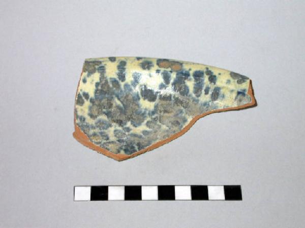 Ciotola frammentaria in ceramica ingobbiata con orlo estroflesso con interno decorato con tocchi di pennello di colore turchino