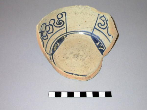 Esemplare frammentario di ciotola in maiolica con orlo indistinto verticale, cavetto emisferico e fondo piano leggermente concavo.