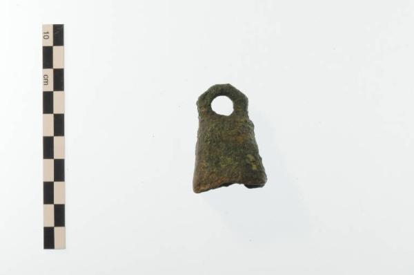 Campanello in bronzo di forma troncopiramidale, con alla sommità anello per sospensione. Privo del battaglio, che doveva essere in ferro.