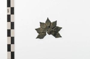 Probabile decorazione applicata su mateteriale deperibile (cuoio?) facente parte di abbigliamento militare della guerra di successione di Francia e Spagna contro l'Austrai (1702-1705). Materiali simili, custoditi presso il Museo, da Monte Faita (ricerche di superficie, 1999-2002).